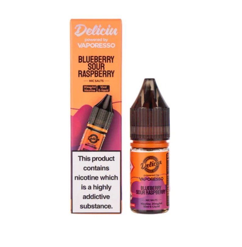 Blueberry Sour Raspberry Nic Salt E-Liquid by Deliciu V2 mixes bright blueberries and tangy raspberries with intense sour candy notes. A fruity, sweet blend with a lipsmacking zing to keep your tastebuds dancing.