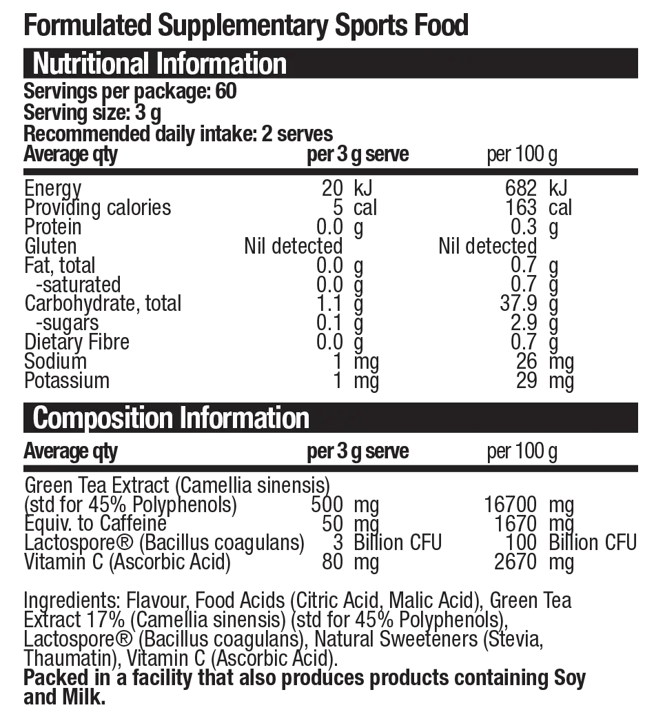 Your morning cup and afternoon pick me up, just got better! Body Science Green Tea TX100 is a unique blend of green tea extract, gut friendly probiotics and powerful antioxidants designed to support all aspects of your good health and vitality! Scientifically formulated to help stimulate healthy thermogenesis, aid detoxification, boost metabolism, support immunity and assist in maintaining a healthy immune system. Each serving of Body Science Green Tea TX100 packs in over 12g of Green Tea Leaf Extract to help increase your metabolic rate, optimise fat loss and provide antioxidant support and 300mg of immune boosting and antioxidant rich Vitamin C to help you manage the stressors of everyday life, as well as, 3 billion CFUs of Lactobacillus plantarum, a powerful probiotic to enhance gut health and overall immunity! With only 7 calories per sachet, no added sugar, no artificial colours, flavours or sweeteners – it’s a great addition to any weight management, training or health regime!