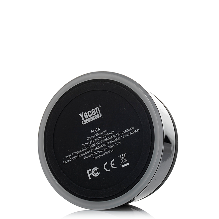 Utilize the Yocan Black Celestial Flux Wireless Charger, offering a 5200mAh battery, wireless charging capability, and includes Type-C or USB-A charging. With effortless function, the Yocan Black FLUX Charger is perfect for those that love to dab, providing ample power to quickly charge your Yocan Black Celestial E-Rig. In addition, the wireless charging feature can support a variety of other devices such as cellphones, smart watches, and even wireless earbuds. Equipped with a USB-A and USB-C port, the Flux Charger can accept and deliver power at a moment’s notice, outputting up to 10W for fast charging capabilities.